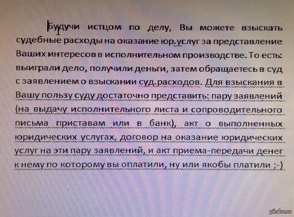 Представьте ненадолго, что вам пришлось судиться. Дело достаточно верное, юристы попались хорошие, спустя полгода вы выиграли, еще через месяц решение суда вступило в законную силу. Обошлось вам все удовольствие в 7000 рублей пошлины для любимого государства и 18000 рублей юристам. 7000 пошлины суд еще в решении взыскал с ответчика, теперь встает вопрос о том, чтобы взыскать и сумму, которую вы потратили на юридические услуги.