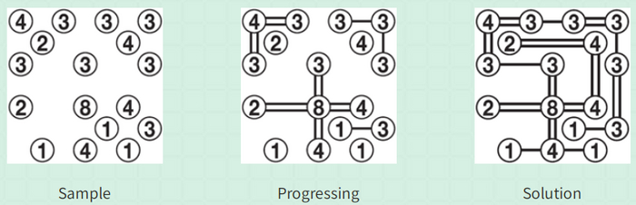 Изначально на рисунке указано число в каждом кружке, изображающем острова. Нужно соединить острова мостами в виде прямых линий по следующим правилам[1]: