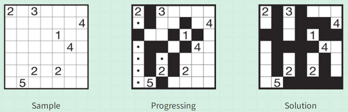 4. Where are the black cells? ( 黒枡くろマスはどこだ?Kuromasu wa doko da?), Kuromasu (黒くろマス) , Kurodoko (黒くろどこ), опубликовано Nikoli в 2005