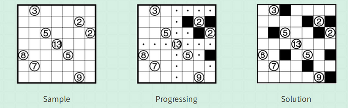 Цифры на доске показывают количество белых клеток от числа до ближайшей черной клетки или до рамки доски (по горизонтали + вертикали).
