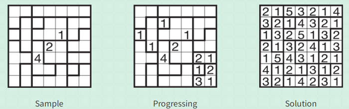 Области, выделенные жирной линией, называются «Комнаты».Все пустые ячейки заполняйте цифрами по следующим правилам.