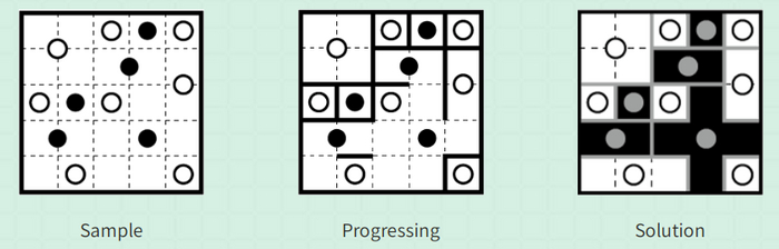 В головоломку играют на прямоугольной сетке квадратов. На сетке расположены точки, обозначающие звезды , которые можно найти в центре ячейки, на краю или в углу.