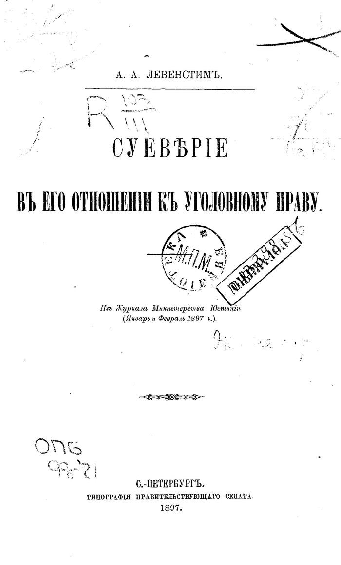 Суеверие в его отношении к уголовному праву / / А.А. Левенстим. — Санкт-Петербург : тип. Правительствующего сената, 1897. — 131 с. : 23