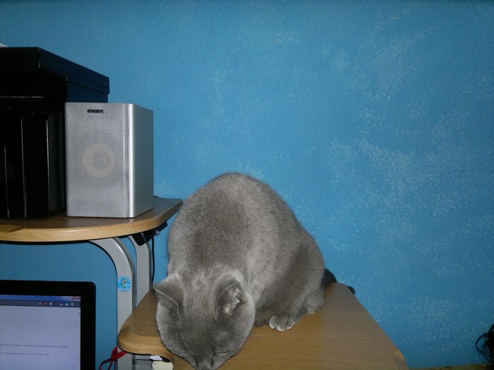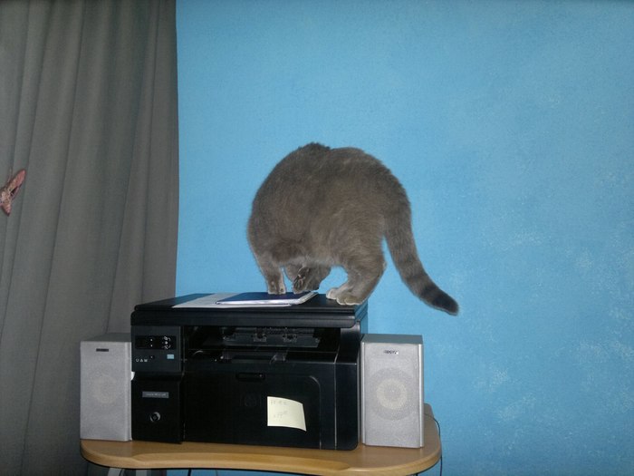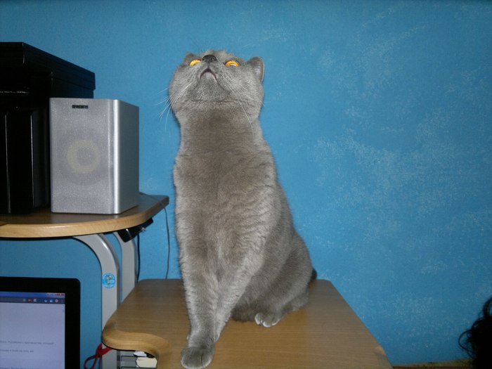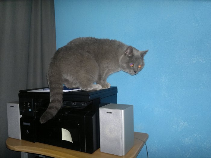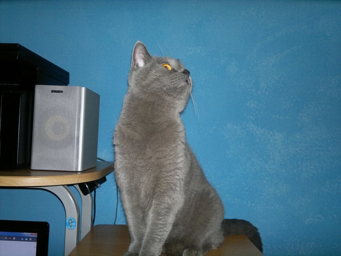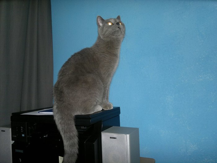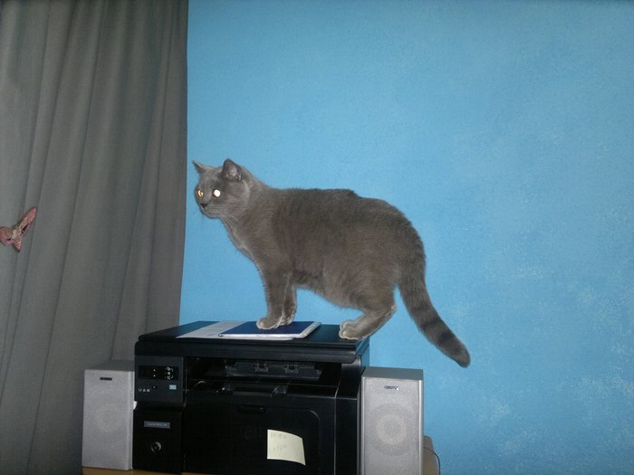 Потом заметила клетку с попугаем, сильно взбудоражилась, замявкала и начала строить планы по запрыгиванию на холодильник, где оная стоит. Судя по проведённому на видео эксперименту, представляет прямую опасность для Чепушилы(одно из погонял попугая).
