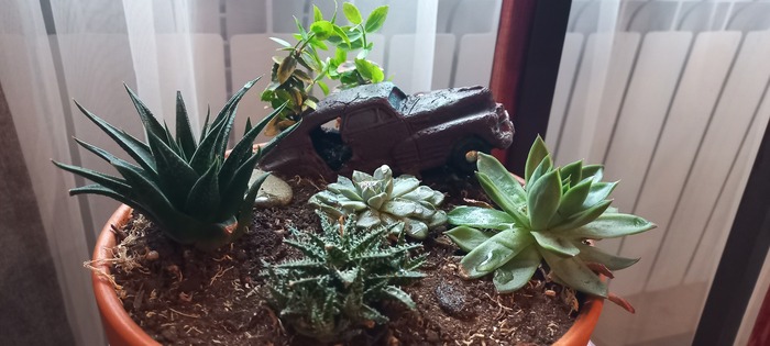 Дренаж и землю для суккулентов приобрел в ближайшем цветочном магазине. А дальше камушек там, веточку здесь... После сборки докинул в салон автомобиля земельки и посадил маленький отросток кустарника.