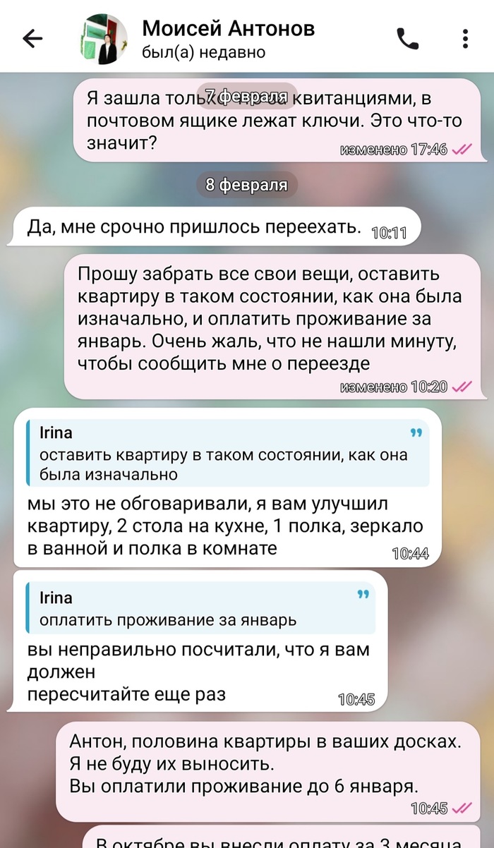 На моё требование оплатить долг за проживание в январе и убрать всё своё дерьмо из квартиры Антон ответил отказом. Цитата: “Мы уборку не обговаривали, я вам улучшил квартиру, сделал вон полку в ванной, стол. За январь у меня всё оплачено, вот тут я смотрю у себя записи, и вообще у вас нет доказательств неоплаты, поэтому дискуссию заканчиваем, если есть пожелания, пишите на почту movsesian@gmail.com”. И бросил трубку. Фото полочки приложу.