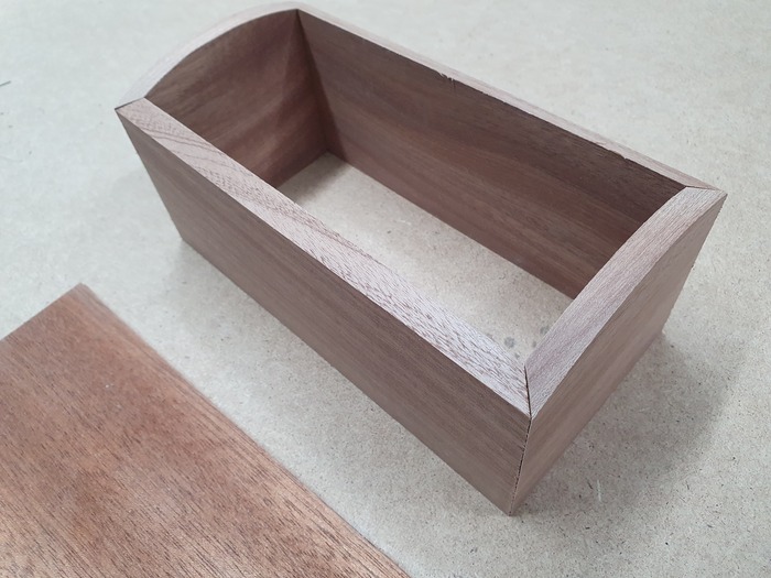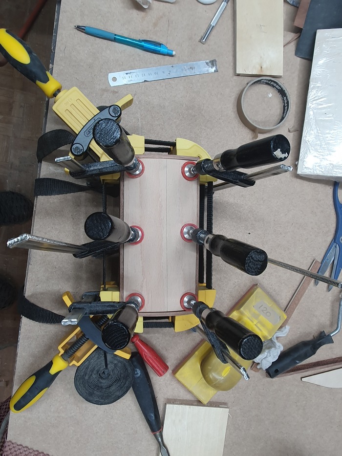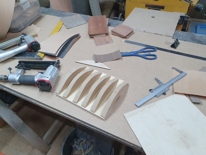 Крышку решено делать как у сундучка, круглую. Ее тоже буду делать из фанеры. Только фанера самодельная, гнутоклееная. Просто набираю пачку шпона и клею ее нужной формы на болване, который делаю из обрезков.