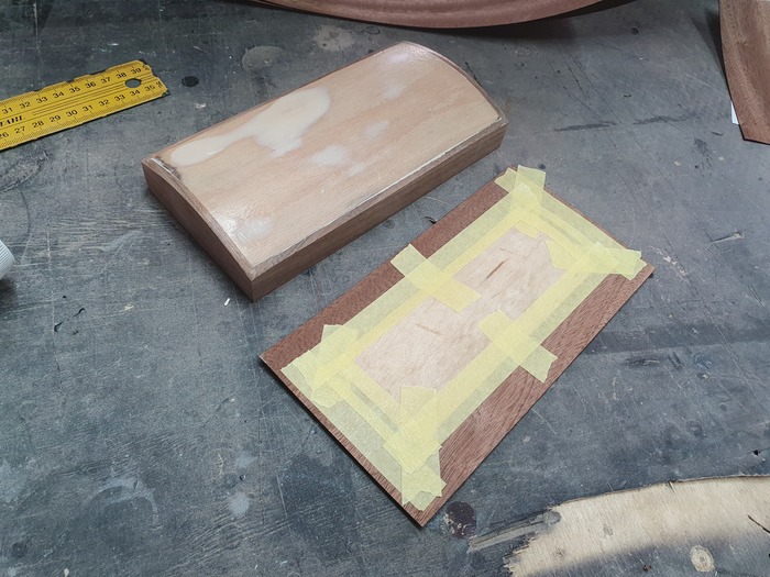 С помощью утюга и клея ПВА приклеиваю рубашку из шпона на крышку шкатулки. Рубашку собираю на малярный скотч. На фото неудачный скотч, от него остаются следы.