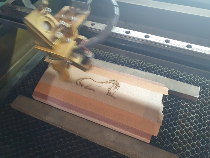 Клею скотч на основу, выжигаю рисунок лазером, а потом заполняю выжженное шпаклевкой и шлифую. Ранее описывал такой метод.