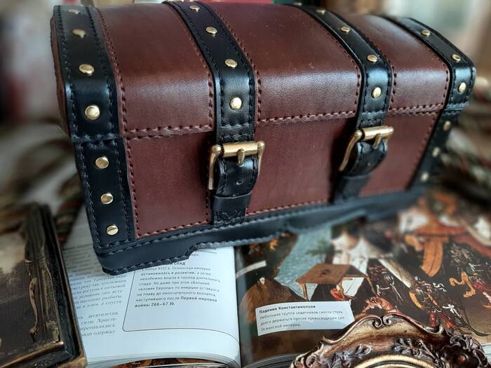 Сундук. Изначально был настроен скептически, по-этому основной материал - пола 2,1-2,5 за 500 руб. Черные вставки - краст 1,1-1,3. Фурнитура - латунь. Нитки - Galases 0,8. Выкройка - от Creative Awl (большое им спасибо). Руки - мои. Фото - любимой супруги.