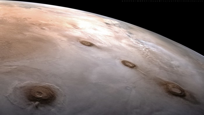 На снимках «Аль-Амаль» можно отчетливо рассмотреть четыре марсианских супервулкана, три из которых «выстроились» в ряд. Это гора Арсия, гора Павлина и гора Аскрийская.