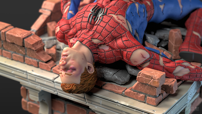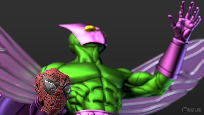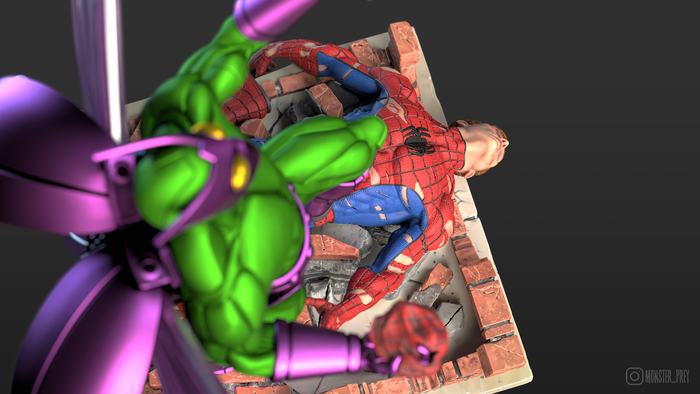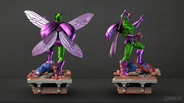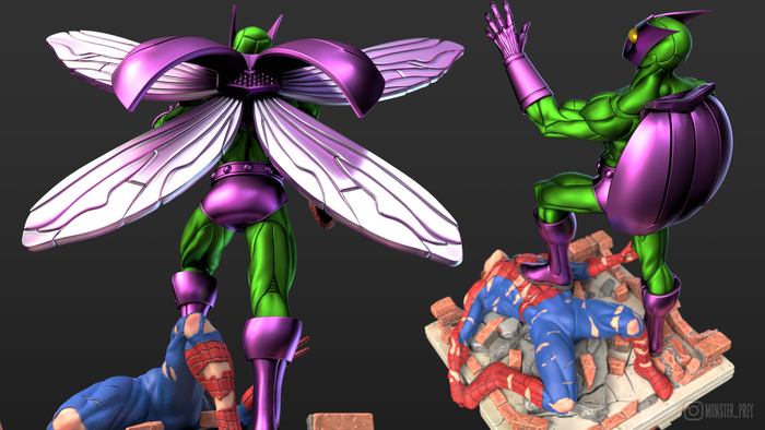 В самом начале я хотел сделать Жука с простой подставкой, но потом мне пришла в голову идея сделать Человека-паука под его ногами. Жук — довольно слабый злодей во вселенной комиксов Marvel. Если ему и удавалось победить Человека-паука, то только с несколькими напарниками. Возможно, в будущем я сделаю ему напарников, и всё это сложится в большую сцену.