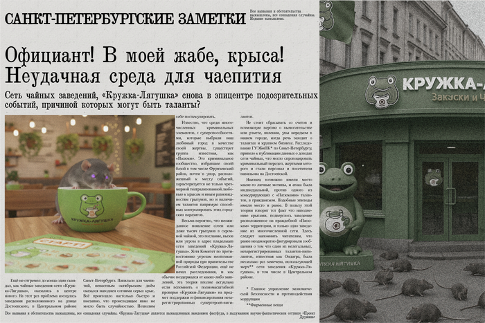 Ещё не отгремел до конца один скандал, как чайные заведения сети «Кружка-Лягушка», оказались в центре нового. На этот раз проблема коснулась заведения расположенного на улице Достоевского, в Центральном районе Санкт-Петербурга. Павильон для чаепитий, ненастным октябрьским днём оказался наводнен сотнями серых крыс. Всё произошло настолько быстро и внезапно, что происходящее явно не могло быть случайностью. Позволим себе поспекулировать.