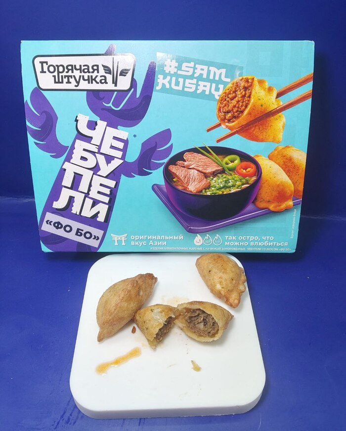 Запах супа Фо бо раздавался на всю кухню из аэрогриля, грелись чебупели. В каждом "пирожке" есть немного фо бошного бульона со всеми нужными специями и вкусами, я этот суп очень уважаю, поэтому узнать его нетрудно. Фарш говядина со свининой, без курицы мех обвалки, всё очень достойно и главное - реально есть заявленный вкус, люди заморочились, за что им спасибо, рекомендую.