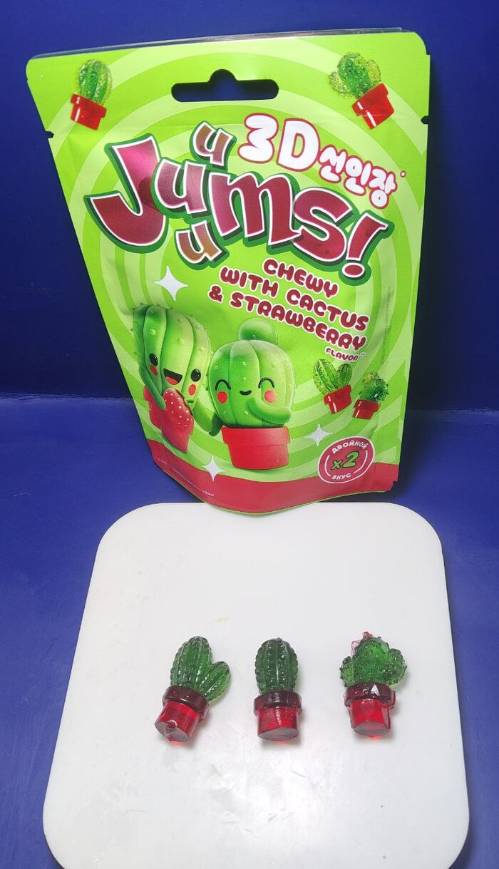 Вы только посмотрите на эту милоту! Как будто перед тобой настоящие маленькие кактусики! Делают мармелад в России, не смотря на все заморские надписи на упаковке, во вкусе преобладает клубника, как в клубничном чупа-чупсе из детства. Мармелад мягкий, немного липнет к зубам, он достаточно сладкий, но главная его фишка - формфактор, только ради этого стоит купить.