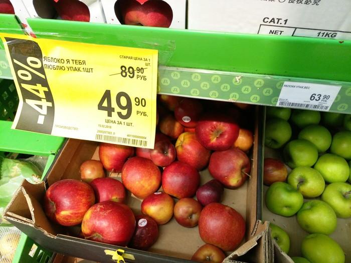 P.S. Снизу лежали те же яблоки, но на развес. 64 рубля за килограмм...