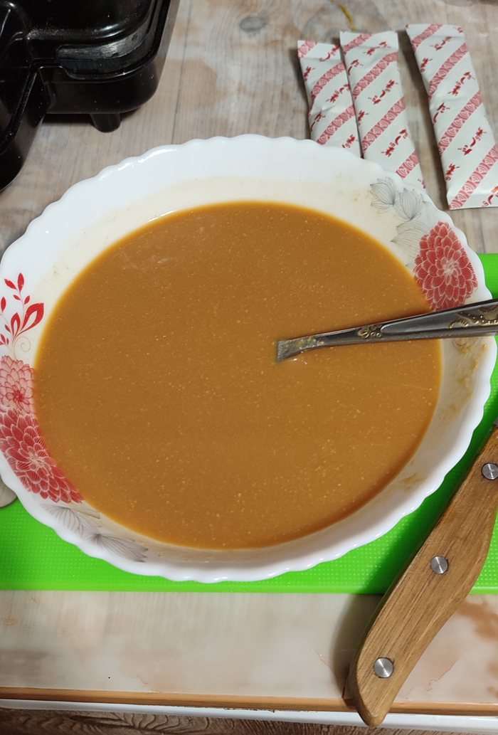 Итого, ну чо. У нас есть две кастрюли с тыквенным пюре и настоящим французским биском. Мешаем!