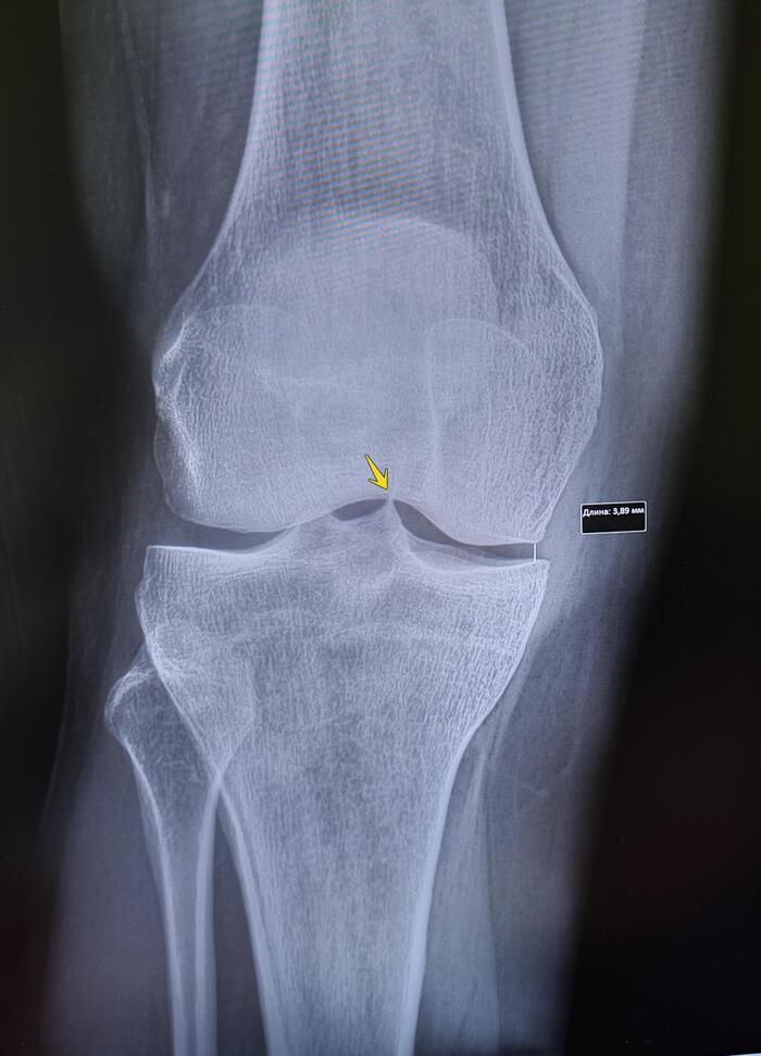 Описание: на Р-граммах правого коленного сустава в 2х проекциях: травматических, деструктивных изменений не выявлено, структура костной ткани не изменена. Неравномерное сужение суставной щели в медиальных отделах до 3.89 мм(норма -6мм), субхондральный склероз суставной поверхности-отсутствует, остеофиты по краям суставной щели не выявлены, заострение медиального межмыщелкового возвышения, надколенник обычного паложения, сужение расстояния между надколенником и бедренной костью не выявлено, полюса надколенника не заострены, остеофиты не выявлены. Заключение: Гонартроз справа 1 ст.
