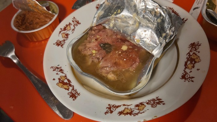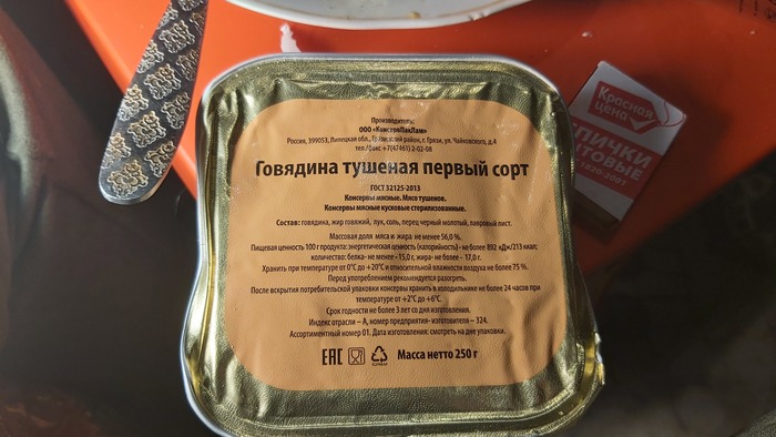 Вновь труп коровки или бычка от производителя "КонсервПакЛам". Тушёночка! Сколько воспоминаний в этом слове возникает у советского человека, сколько эмоций и историй! И, надо сказать, тушёнка хороша. Волокнистое мясо притягивает взгляд, ароматный бульон провоцирует вкусовые рецепторы нагонять слюны. Ничего подобного в пятёрочках, магнитах и прочих сетевых гигантов мне найти никогда не удавалось.