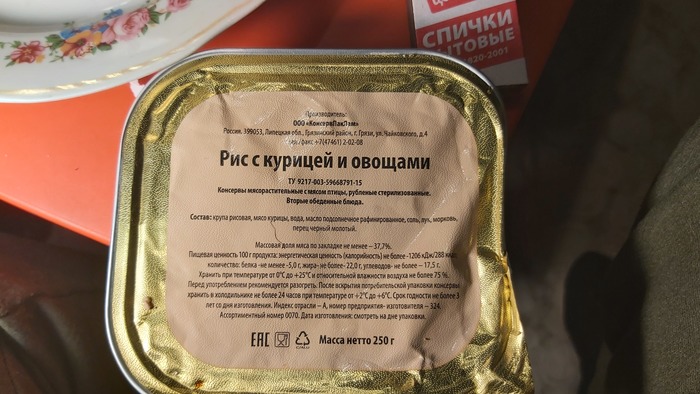 Рис с курицей и овощами. "КонсервПакЛам". Уверен, если ты голодный солдат - будешь уплетать за милую душу. Но добавлять в эту спресованную рисовую кашу молотые кости - это преступление. За такое шлёпнуть в бубен необходимо производителю, потому что кости не очень полезный продукт. А травить солдата - преступление против родины. В целом со взгляда сытого - съедобно, как и говядина, но невкусно.