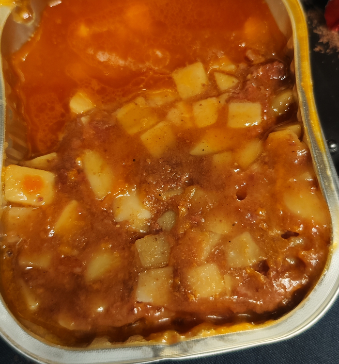 Вот такой внешний вид подогретой тушёнки. К сожаления упаковка никак не хотела поддаваться моему физическому воздействию, в результате чего я замонздрячил жиром всё вокруг в радиусе километра и заодно всего себя. Падлюка. Но ничего. Где наша не валялась!
