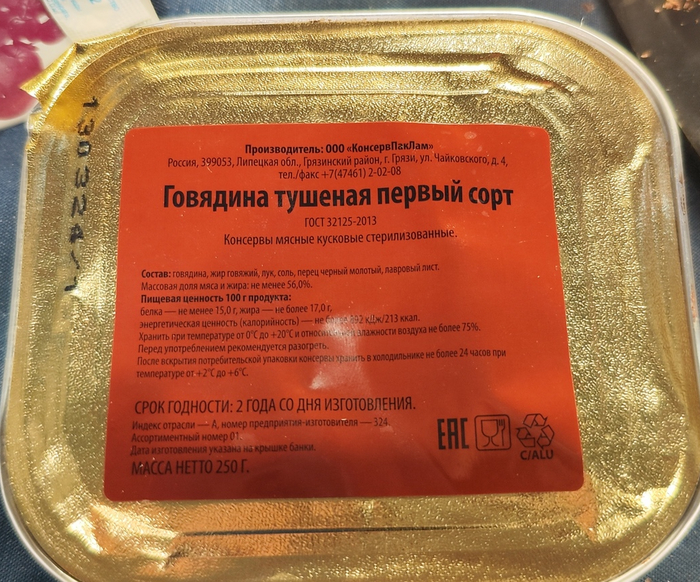 Говядина тушёная первый сорт. ООО "КонсервПакЛам". Липецкая область, Грязинский район.