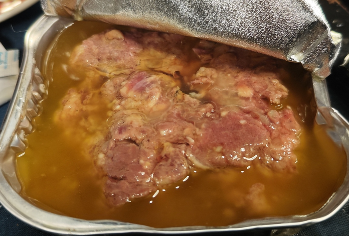 Внешний вид тушёнки немного настораживает: слегка подозрительно яркий розовый цвет. Вероятно нитритной солью производители всё же баловались. Запах мясной. Бульон жирный, приятный. Мясо тоже с вкраплениями жирка, который расползается по ротовой полости. Структура мяса довольно таки плотная, но в основе не волокнистая. Фарш. Это как-то огорчает. Перец, лавровый лист лежат на своём месте. Соли слегка с избытком. В целом хорошая тушёнка. Есть можно.