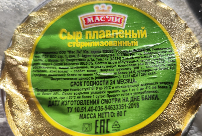 Сыр плавленный стерилизованный. ООО "Мас Ли". Производство находится во Владимирской области. Город Муром.