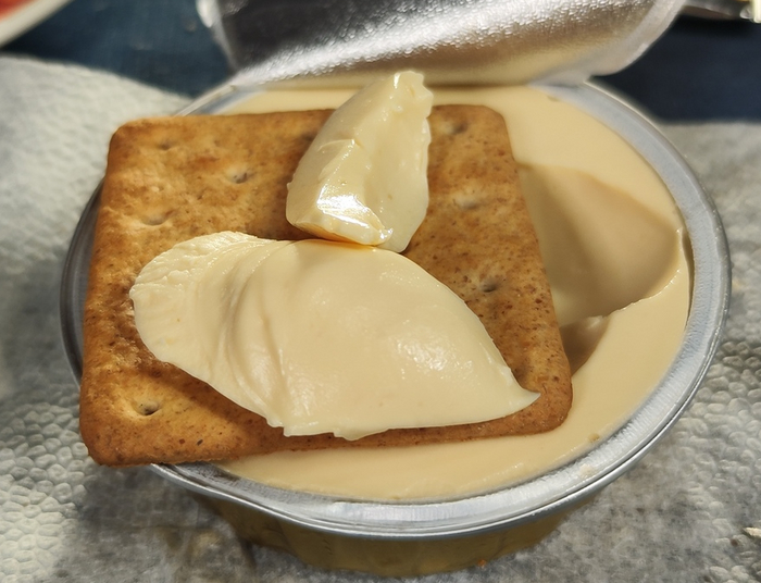Яркий запах на отдалении напоминающий колбасу. Где-то вот там далеко - далеко. На горизонте. По вкусу всё аналогично, но по текстуре вкрапления жира не очень приятны. Сразу заметна работа усилителя вкуса. И здесь уже явный, на мои вкусовые чувства, пересол. Такое себе. Не очень. Но есть будем. Ёжик колиться, но тёплый. Правильно?! Чего нос морочить. Галета, к слову, ситуацию вновь немного исправляет.