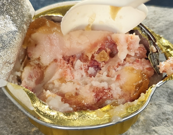 При всём при этом запах весьма хороший. Действительно есть мяско, которое просто тащит на себе всю сложившуюся ситуацию. Его нет, чтобы много, но оно присутствует. Кто-то здесь отдал свою жизнь во имя блюда. Так же не промахнулся производитель с балансом соли и перца. Избыток соли даже немного спасает ситуацию. Рис подвёл, но сожрём и это! Дальше.