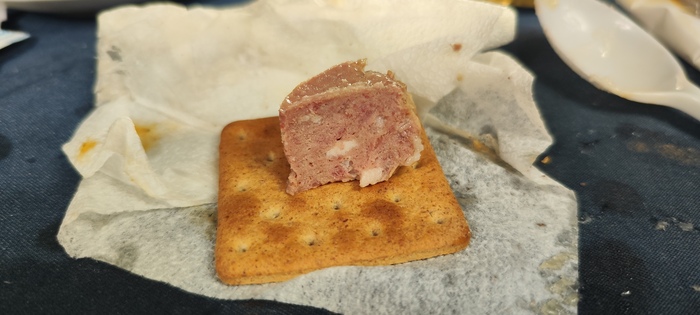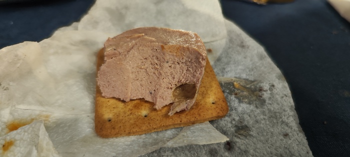Правда с галетой всё же паштет смотрится немного лучше. Она оттягивает часть неприятных ощущений и балансирует вкус хлебными нотками. Дальше.