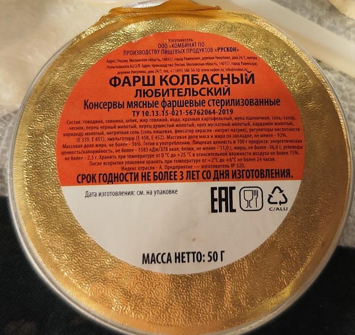 Фарш колбасный любительский. Опять "РУСКОН". Город Раменское.