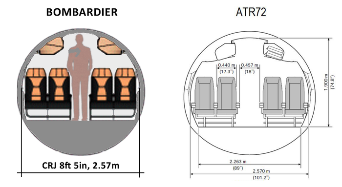 А если вспомнить, что ширина салона CRJ равна 2,57 м, то станет понятно, почему в начале нулевых в лидеры вырвался Эмбраер. Мне как-то раз «посчастливилось» летать на CRJ-200 и в следующий раз я возьму на него билет, только в случае, если других вариантов не будет. Интересно то, что ATR-72 имеет точно такую же ширину салона как и CRJ, но лететь на нем на много приятнее, потому что его кресла шире как раз на те самые 3 см. Правда центральный проход у него уже, но лично мне на это было насрать. Куда важнее то, что ни в том, ни в другом самолете багаж девать некуда, приходится его сдавать, а это значит, что ширина этих самолетов недостаточна.