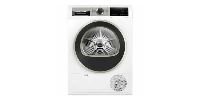 Вторую ступеньку рейтинга занимает премиальная сушильная машина Bosch WQB245B0ME с дизайном AntiVibration. Она одна из самых тихих в рейтинге с показателем шума в 61 дБ. Модель наделена вместительным барабаном объемом 112 л, в котором можно высушить до 9 кг белья. В барабане есть подсветка.