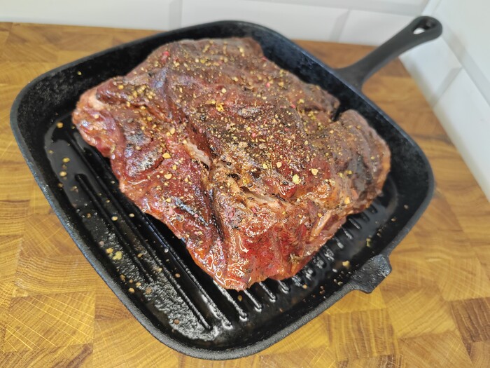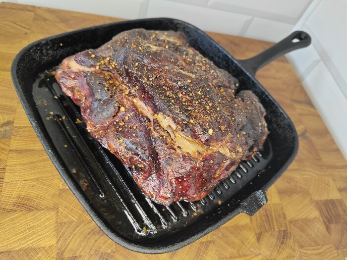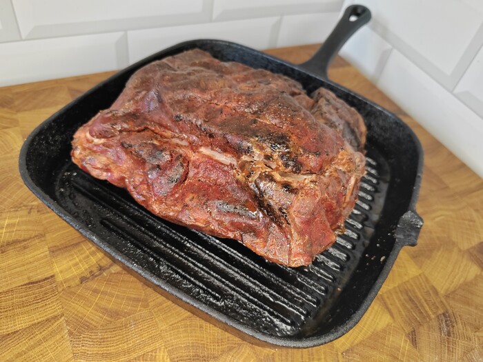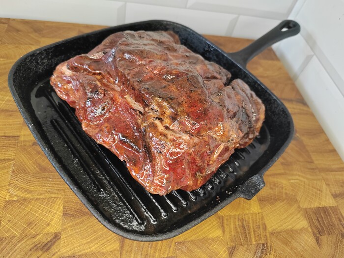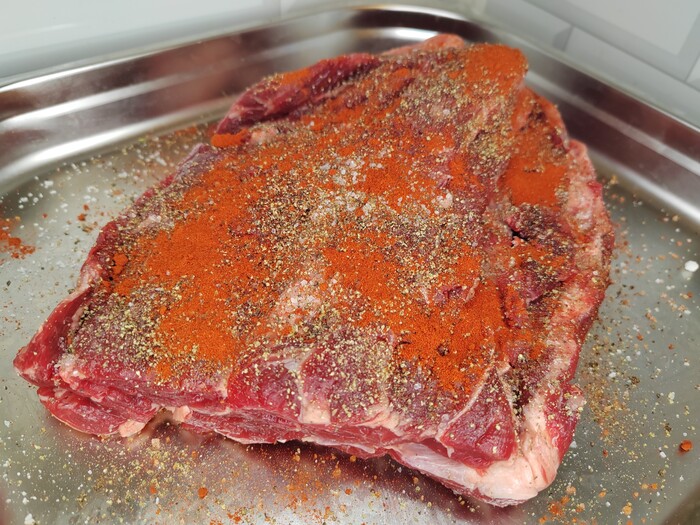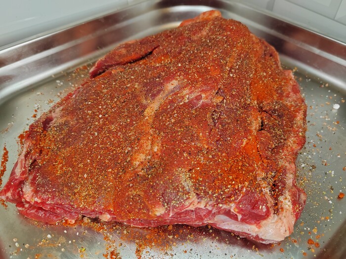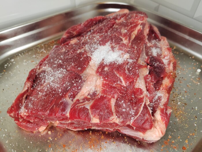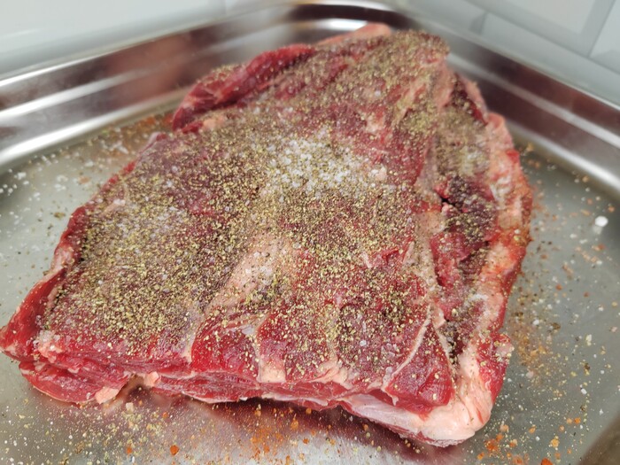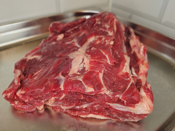 А какое мясо вообще нужно? Премиальные куски оголтелой мраморности значит ни к чему. Но и куски формата ТОЛЬКО МЯСО НИЧЕГО КРОМЕ МЯСА тоже не очень подойдут - такое тоже лучше пускать на условный ростбиф. Нужны отрубы с каким-то количеством жира, с плёнками и прочей соединительной тканью. А хорошо бы ещё чтобы куски были "волокнистые". Идеальный отруб - это, собственно, брискет (удивительно, да?), сиречь грудинка. Там и слои жырчика есть, и пленки какие-то. Но, как я уже писал в массмаркете найти брискет непросто. Да и стоит он вообще негуманно. Отлично подойдут толстый край (повторюсь, я сейчас массмаркет рассматриваю, а не премиальные магазины), тонкий край. Нормально получится и из говяжьей шеи. Если получится найти мясо на рёбрах - тоже очень ок будет.