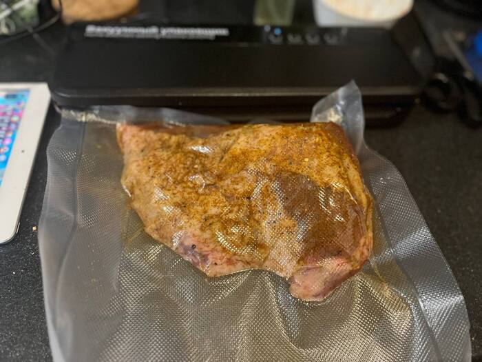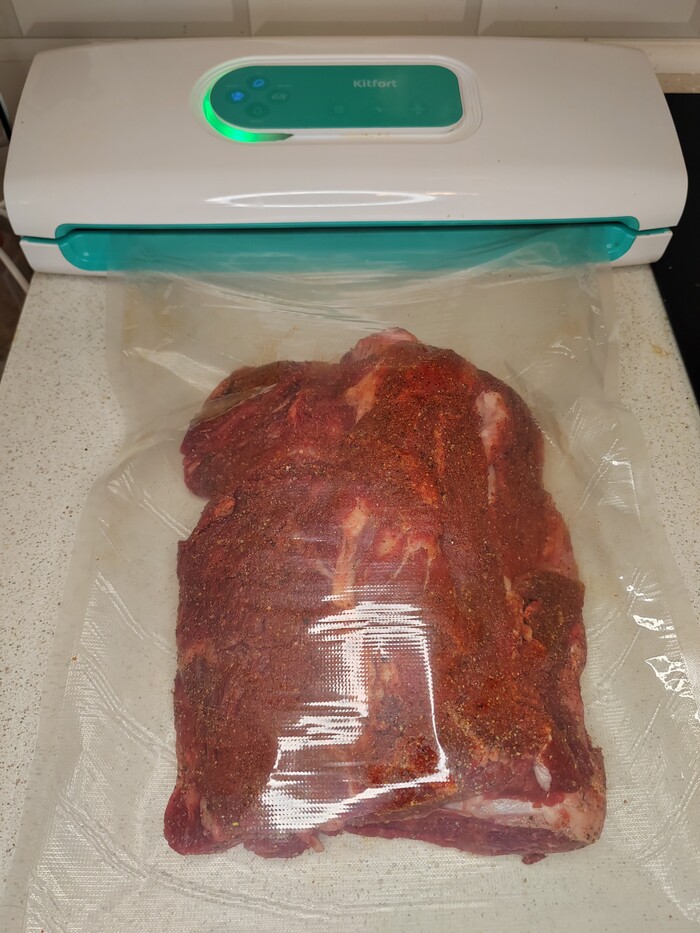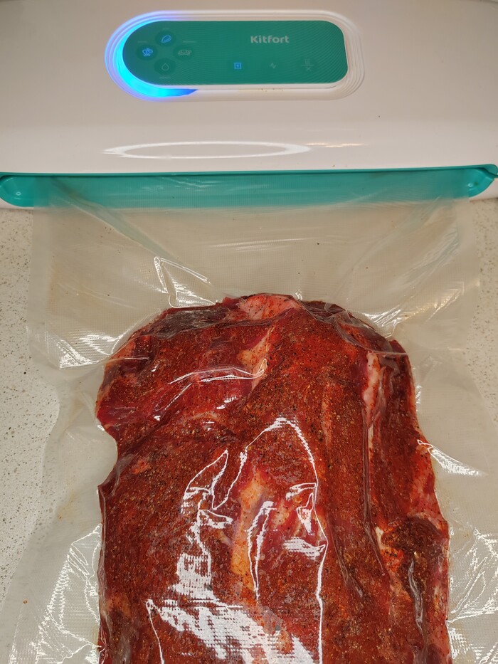 Натираем полученные куски смесью солей и специй и вакуумируем, согласно инструкции к вакууматору, убираем в холодильник на 3-5 дней, в моем случае 4 дня было идеально. 1-2 раза в день, мясо в пакете лучше переворачивать, но не критично, если забудете.