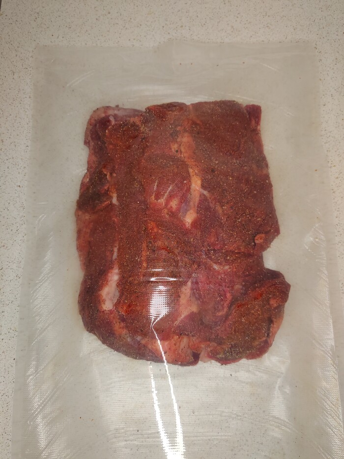 Взял 1 кг шеи, порезал на 3 куска, в целом чуть-чуть нарушая пропорции автора( в большую сторону) натёр все смесью из солей, перца и сухого чеснока и завакуумировал все 3 куска.