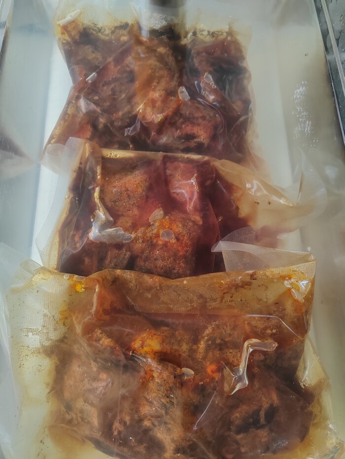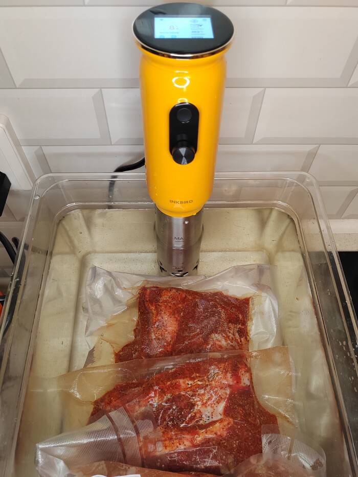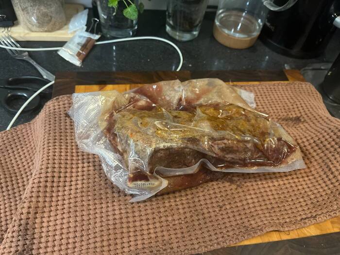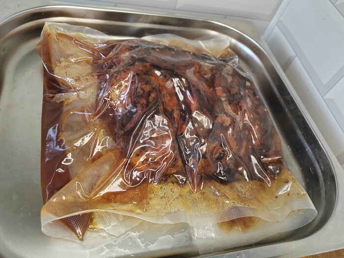 10. Расчехлим сувидло и поставим все вариться. Первый этап - 60° на 24 часа. На такой температуре в мясе разрушатся миозин и миоглобин, а вот для денатурации коллагена такая температура низковата, поэтому появится какое-то количество жидкости (относительно небольшое), в которой мясо будет, по сути, ускоренно просаливаться.