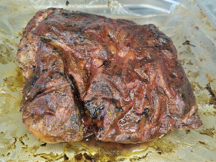В итоге было решено сразу же перекидывать его в духовку на ужин, поэтому мясо продолжило лежать и отдыхать при температуре 68 градусов ещё 3 часа, а я к этому времени разогрел духовку (у меня обычная газовая в плите, выставил её на 250 градусов). Вот что я извлек из пакета: