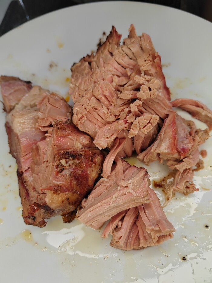 Да, разумеется, что это не брискет и не сувид. Однако как вариант реанимации достаточно жёсткого и жилистого мяса — топчик. Говядина получилась нежной, сочной, ароматной и распадающейся на волокна. Единственное, что я б её в следующий раз держала не 3 часа, а все 5, потому что в районе жилы (которая прям по центру куска на левой тарелке) оно всё-таки было жестковато. Но в целом эксперимент считаю успешным.