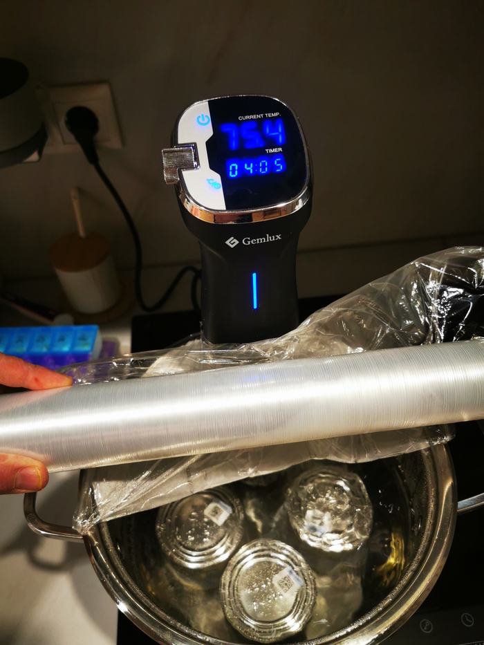 Ставим стик су-вида в ёмкость ( у меня кастрюлька и настраиваем нагрев 65 гр, время 60 минут. Ждём пока температура в кастрюльке наберётся и закидыаем пакетики. После того как время на таймере закончится, охлаждаем максимально быстро под проточной либо ледяной водой.