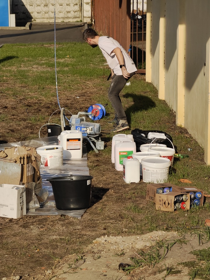 И вот появились люди, техника, пошёл процесс. Балонов с краской и прочих материалов у них конечно ёёёёёмаёёё!