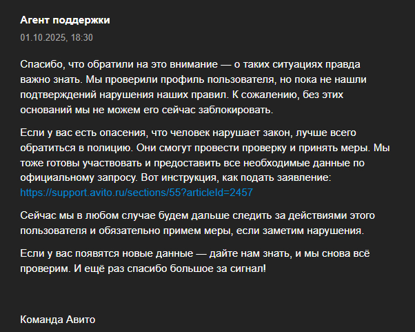 Но даже если покупатель имеет доказательства, например скрины переписки то смысла в этом нет, Авито их даже не попросит, они вообще не видят в этом нарушений их правил.