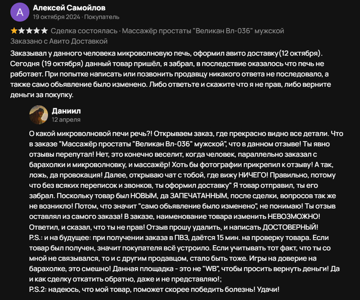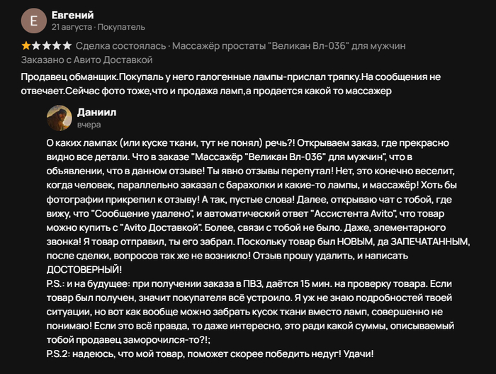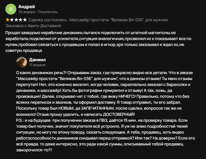 И да на Авито нельзя прикреплять переписку с продавцом так что и доказательств не будет. И у покупателя в его же заказе будет написано «Массажёр простаты» а не «Динамики рабочие».