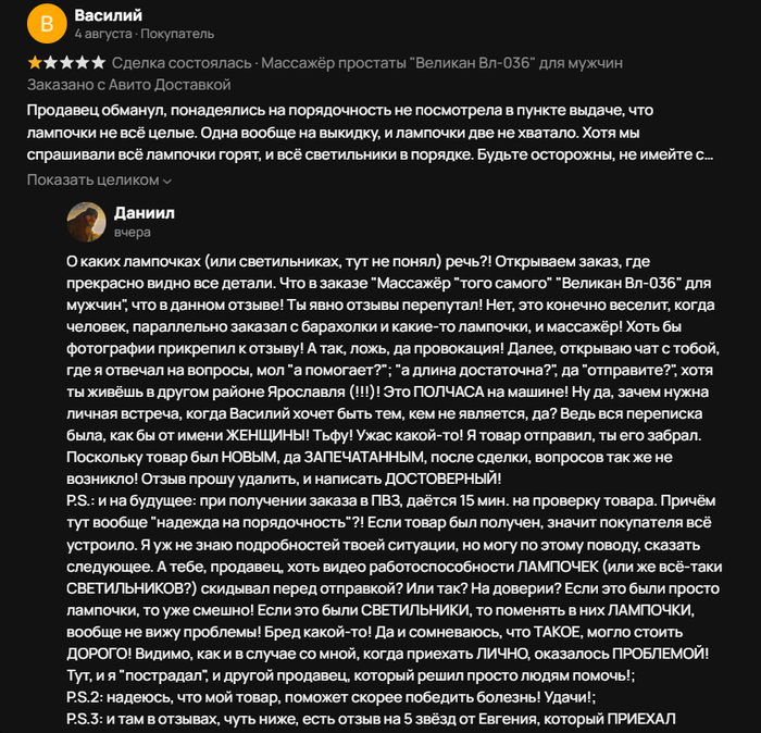 Вы после того как был оформлен заказ меняете название объявления на «Массажёр простаты» и закрываете его, а после вообще удаляете. Таким образом это объявление не будет видно в вашем профиле. Покупателя в ЧС что бы не нервировал. А в ответ на отзыв пишите: «О каких динамиках речь?! Открываем заказ, где прекрасно видно все детали. Что в заказе "Массажёр простаты для мужчин" Ты явно отзывы перепутал! Нет, это конечно смешно, когда человек, заказал сразу с барахолки и динамики, и массажёр! Хоть бы фотографии переписки прикрепил к отзыву!"»