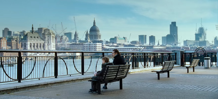 Лондон, набережная Тэмзы, возможно, центр. И столько башенных кранов в кадре!