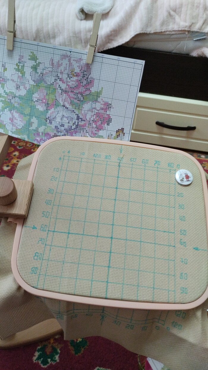 После не сложных манипуляций, я вставляю пяльца в станок, на него же креплю схему, и начинаю свою работу...
