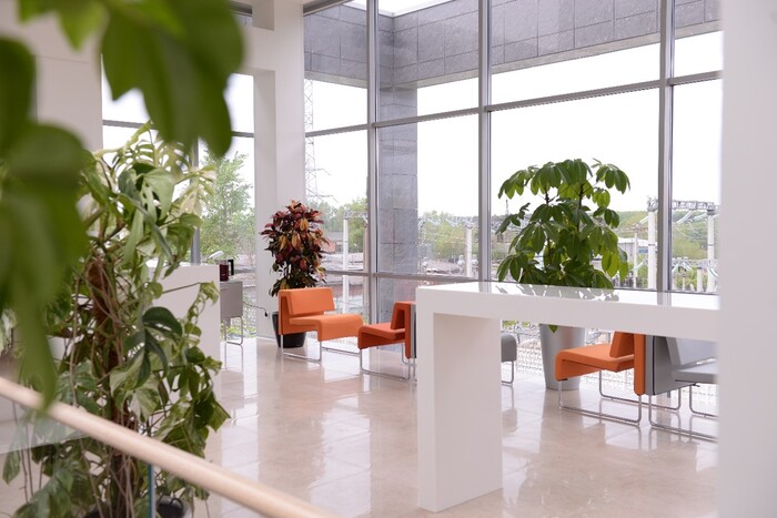 По всему офису расставлено большое количество растений, которые создают уют и разбавляют конструкции из стекла и бетона частичкой природы.