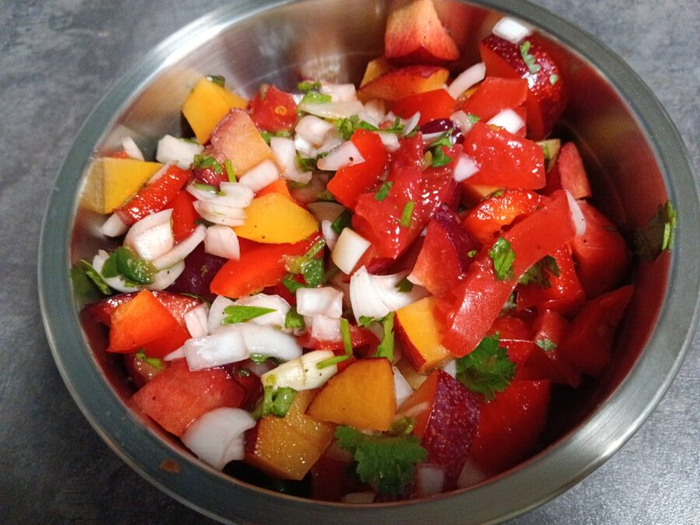 Для сливовой сальсы нарежьте сливы, красный перец, помидор крупными кубиками, белый лук и халапеньо - мелкими кубиками, нарубите кинзу. Переложите в миску, добавьте сок и цедру лайма, приправьте солью и черным перцем. Уберите в холодильник минимум на 60 минут. Перед сборкой перемешайте.