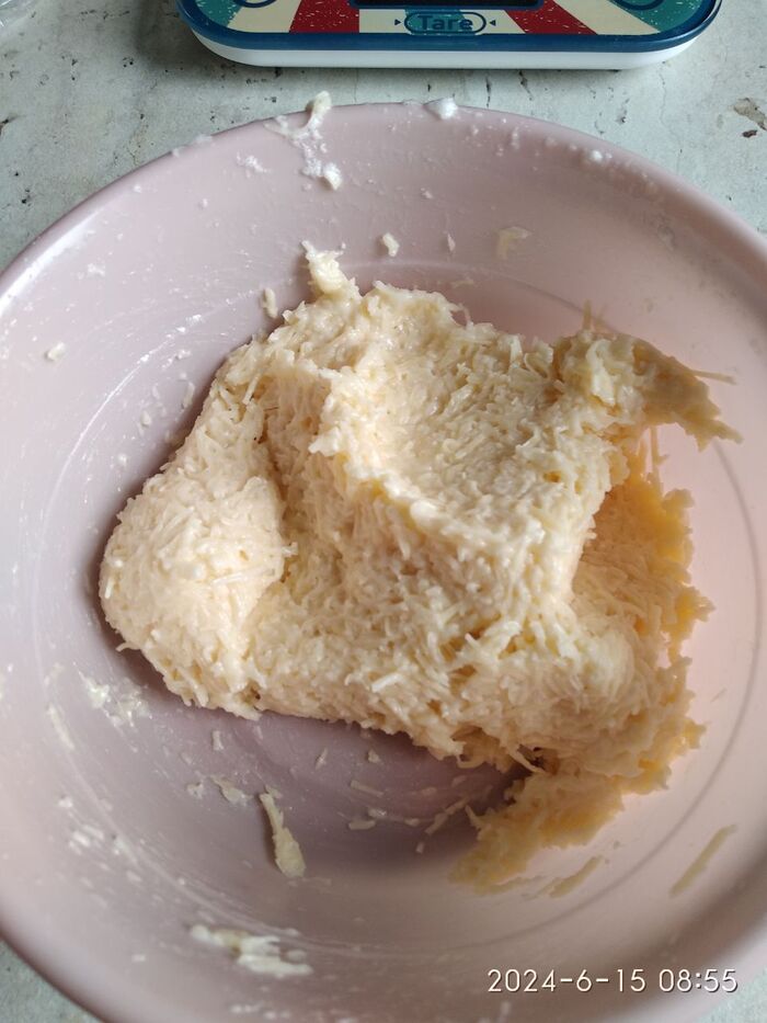 200 гр. Твердого сыра (у меня это «Гауда»), натерла на мелкой терке и добавила его к взбитым белкам.